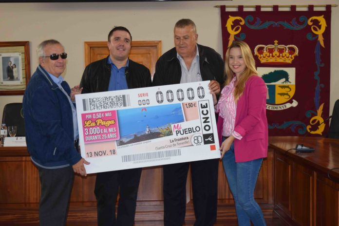El cupón de la ONCE del día 13 de noviembre está dedicado a La Frontera Una estampa que refleja emblemas del municipio como es el Campanario de Joapira o los Roques de Salmor El 13 de noviembre, el Cupón de la ONCE está dedicado al municipio de La Frontera; el Campanario de Joapira sirve de telón de fondo de uno de los boletos que esta Organización Nacional ha elegido en coordinación con el Ayuntamiento de La Frontera para su emisión el próximo martes. Ayer precisamente, el alcalde del Municipio, Pedro Miguel Ángel Acosta y la concejala de Turismo, Miriam del Pino Moreno recibían de manos del director de la ONCE en Santa Cruz de Tenerife, Andrés Guillén y del vicepresidente de su Consejo Territorial, Cristóbal Manuel Amaro, el boleto dedicado al municipio y perteneciente a la serie ‘Mi pueblo’ que recoge localidades con nombres singulares. La concejala de Turismo, Miriam del Pino Moreno, ha resaltado que “es todo un honor que la ONCE haya elegido nuestro pueblo, mostrándolo, y conjugando la labor social con la turística, llevando cinco millones y medio de cupones con nuestro municipio por toda España». Entre las características de esta localidad destacadas por esta organización es que es un término municipal con buena parte de su territorio protegido; además de tener en su paisaje una zona como es la del Valle del Golfo con “una geomorfología única”. En la presentación, el director de la ONCE en Santa Cruz de Tenerife, Andrés Guillén, destacó que esta iniciativa es un paseo por todo el territorio español y “que será una bonita manera de promocionar Frontera”. Por su parte, el alcalde, Pedro Miguel Acosta, remarcó la importante labor social que realiza la ONCE y agradeció a esta Organización el uso de “una de las estampas más hermosas de nuestro municipio”. Una imagen que refleja el Campanario de Joapira, con los Roques de Salmor al fondo y un parapente cruzando su cielo, emblemas del municipio expuestos en un boleto que ya está a la venta y que quedará para el recuerdo. … Ver todo el mensaje 4 archivos adjuntos Ok.¡Gracias!Gracias.
